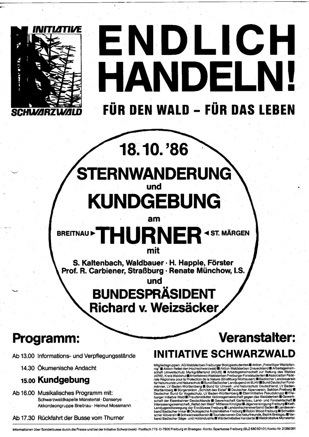 Höhepunkt des Wanderjahres 1986 war der Besuch unseres damaligen Bundespräsidenten Richard von Weizacker im Schwarzwald. Der Bundespräsident war bekannt als eifriger Wanderer, der möglichst in allen Regionen der damaligen Bundesrepublik eine Wanderung durchgeführt hat. In dieser Zeit war das Thema “ Waldsterben“ in aller Munde. So bezeugte er auch durch seine Teilnahme an der Veranstaltung “ Endlich Handeln “ am Thurner seine Solidarität mit den berechtigten Sorgen der Menschen aus dem Schwarzwald. Auch unsere Sektion nahm an der damit verbundenen Sternwanderung und an der Abschlusskundgebung teil.