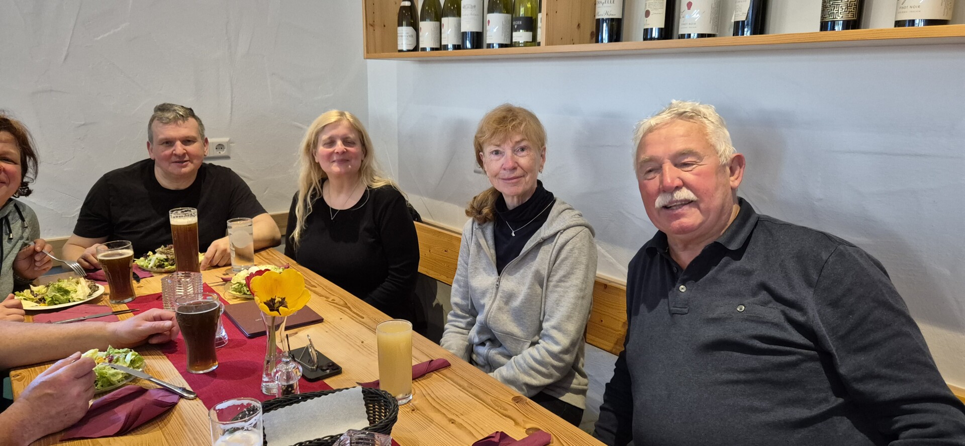 Nach einer verregneten Nacht trafen wir uns um 8:30 am Bahnhof in Breisach. Es war noch früh, denn in dieser Nacht wurden die Uhren umgestellt. Nach einer Fahrt mit Bus und Bahn erreichten wir Staufen. Bei kühlen Temperaturen von ca. 3 Grad starteten wir unsere Tour  auf dem Obstbaumpfad. Die geplante Strecke über die St. Johanniskapelle und den Messerschmiedfelsen  musste leider aufgegeben werden. Die schmalen Wege waren schon zu Beginn sehr rutschig und schmierig.  So streiften wir dann doch die Peripherie von Staufen. Am Schwimmbad vorbei, über den Neumagen und die Bahnlinie  näherten wir uns allmählich unsererer Aufstiegsroute Richtung Schleifsteinhof. Beim Blick zurück konnten wir den Porphyrfels am Messerschmiedfelsen mit der heiligen Barbara erkennen. Die Bestände der seltenen Roteiche unterhalb der Felsregion waren nur zu erahnen. Hingegen war der Wintereinbruch im Münstertal sehr präsent und eindrucksvoll. Glücklicherweise besserte sich das Wetter beim weiteren Weg zur Ziegelhofstrauße immer mehr. Alle Wanderer waren erfreut als zum Aufwärmen und zur Mittagsrast die Ziegelhofstrauße erreicht war. Gut gestärkt und zufrieden machten wir uns auf den Rückweg nach Staufen. Mit Sonnenschein im Rücken liefen wir auf der westlichen Seite der Rebberge über Grunern zum Ostbahnhof von Staufen, von wo wir die Heimreise antraten.